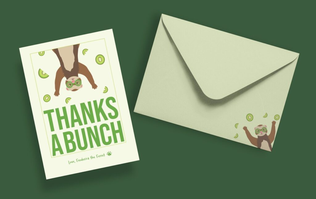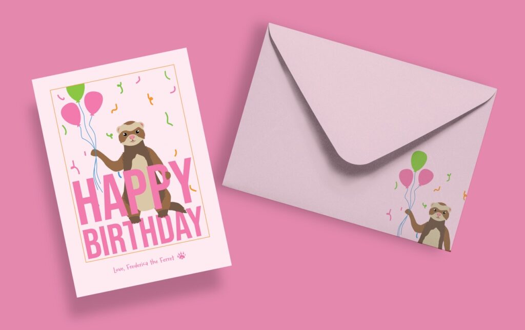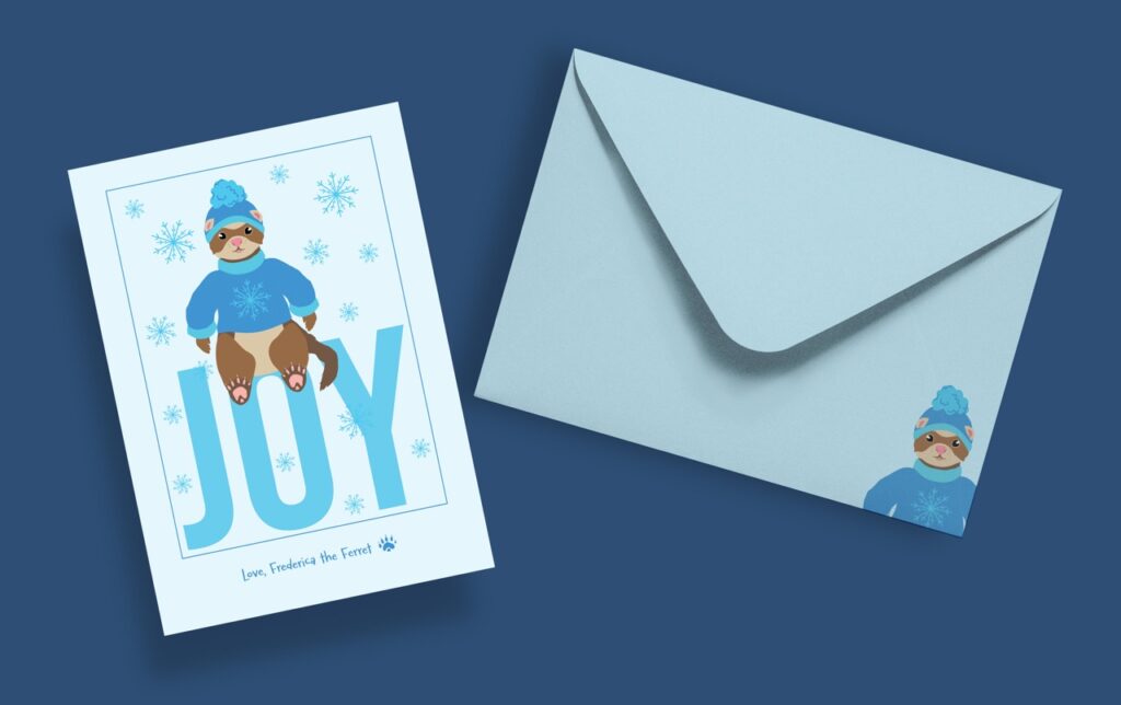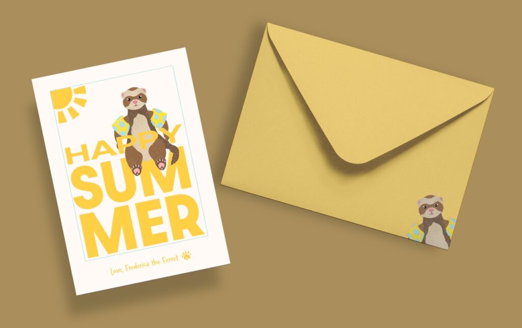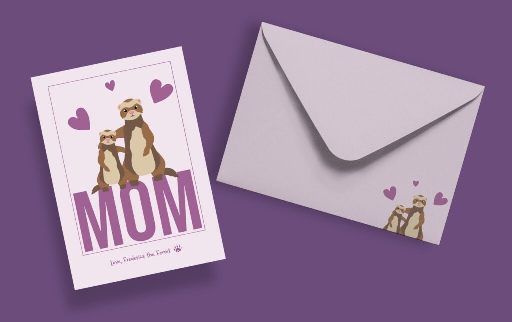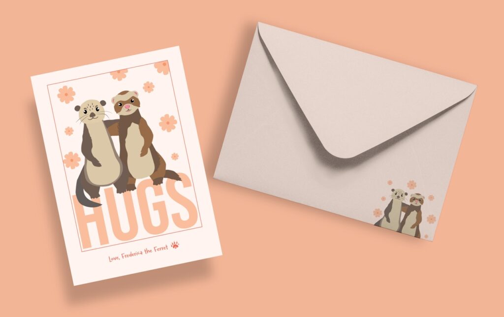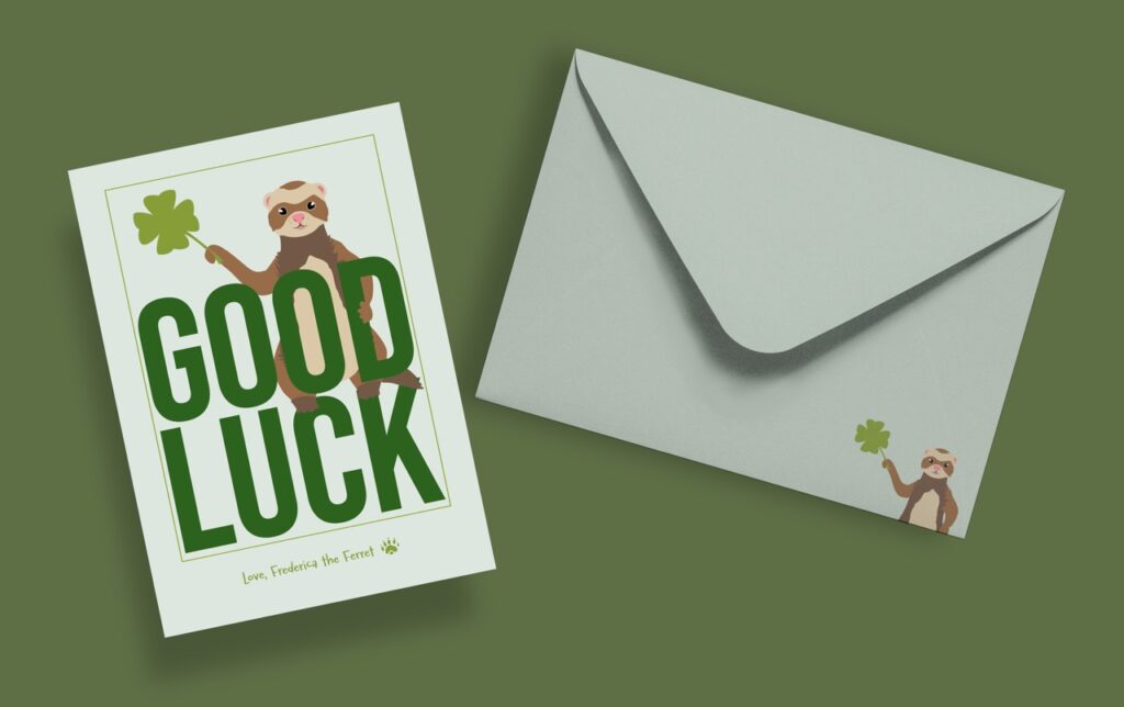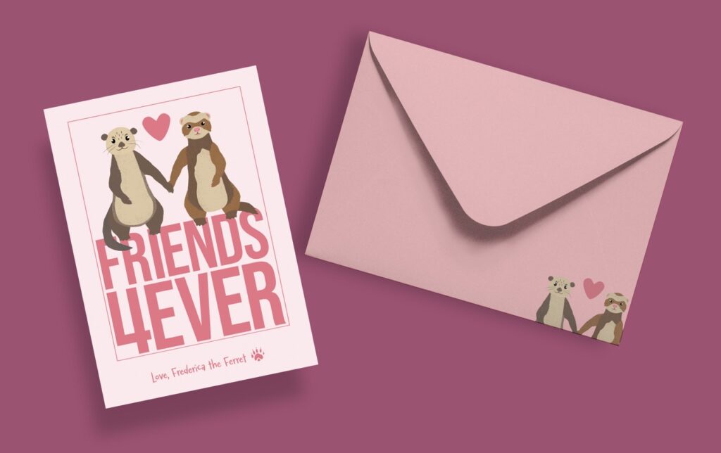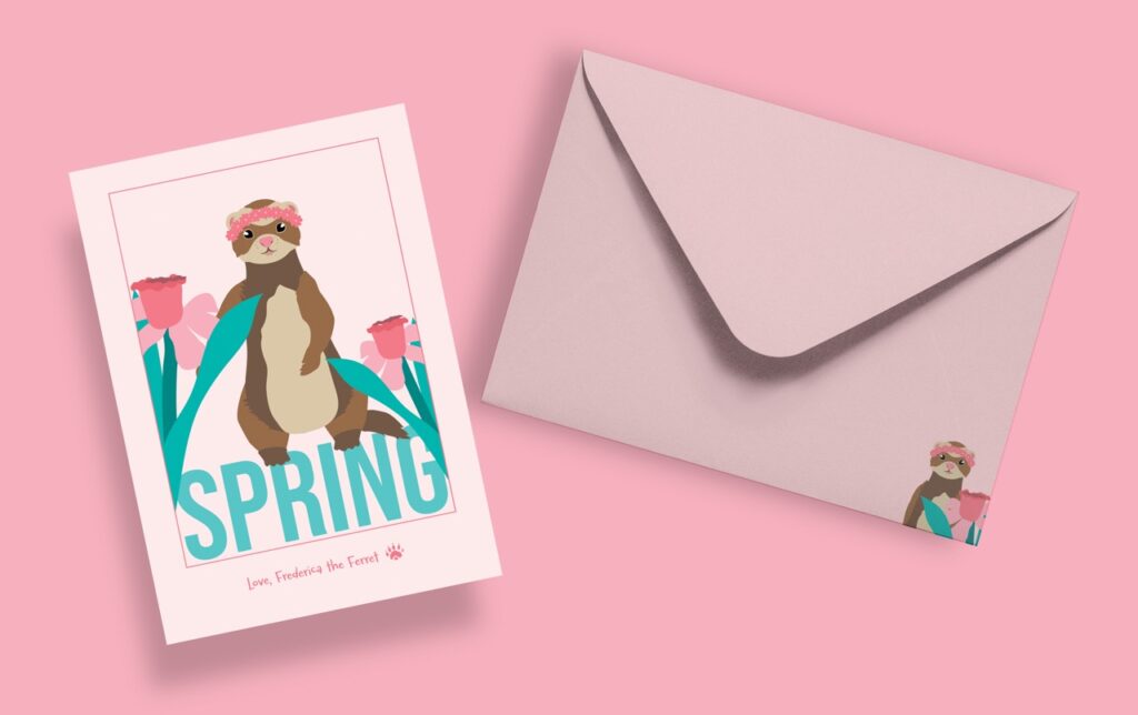 I designed this greeting card series for a Typography two class. I chose to have a ferret be the be the main character because I had two growing up, and I feel like they get a bit of a bad rap. The idea was to play around with type in a way that was fun and adventurous. I filled each card with blocky text and accompanied it with a fun illustration.