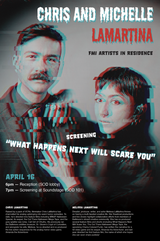 I designed this poster for the Film and Moving Image Spring Artists-In-Residence event. First, I researched Chris and Melissa and watched the trailer for their movie. From this, I came up with the digital theme. After using Photoshop to create the glitchy 3D effect, I then designed the type layout in InDesign. The final printed poster was 24×36 inches.