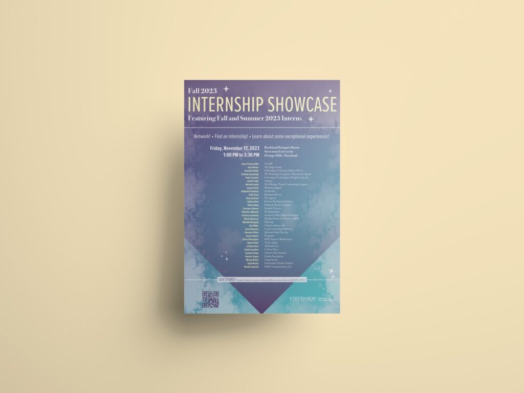 I was asked to design this 24×36 poster for Stevenson University’s 2023 Internship Showcase. I created the background using brushed in Photoshop and the laid out the text and other graphics in InDesign.